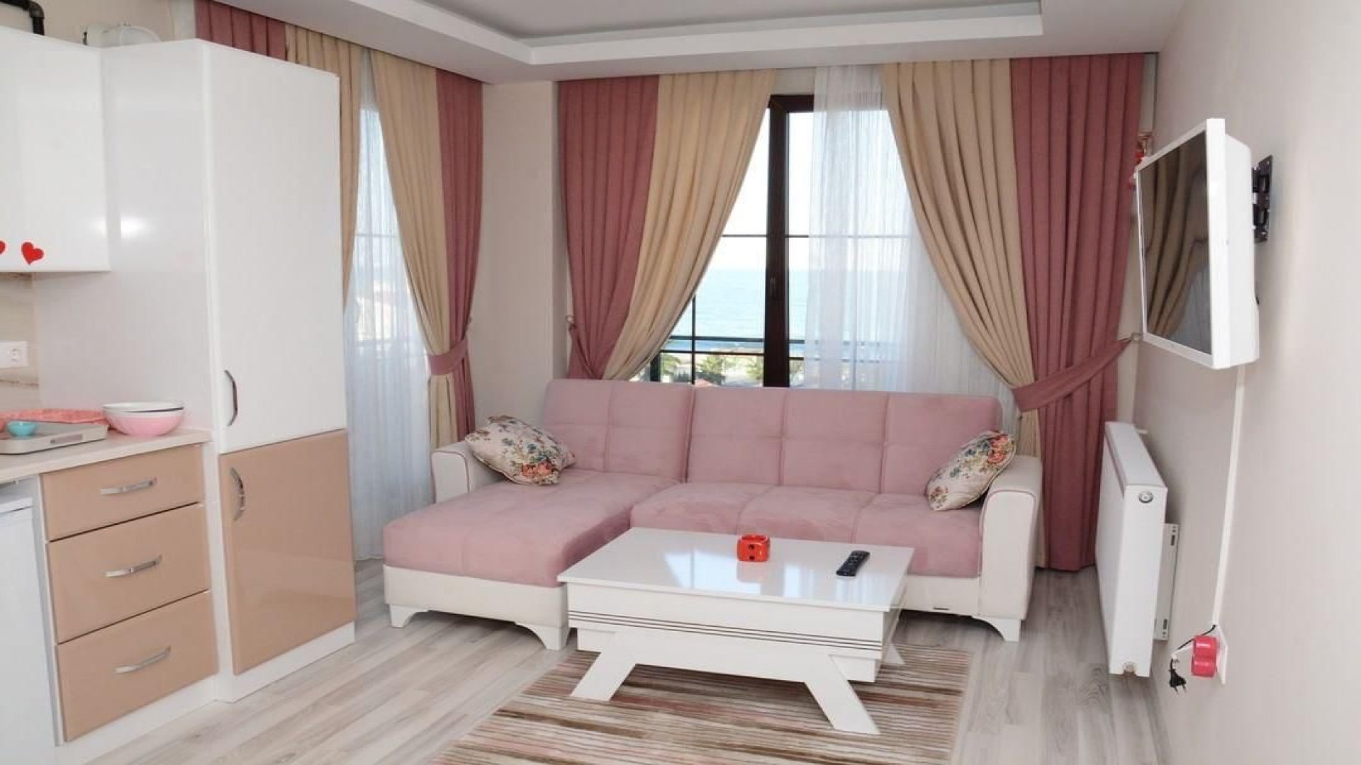 Pembe-bordo sıcacık yuvamızda; deniz manzaralı geniş pencere, mini mutfak, açılır L koltuk-yatak ve rahat çift kişilik yatakla 4-5 kişi çok konforlu kalı
